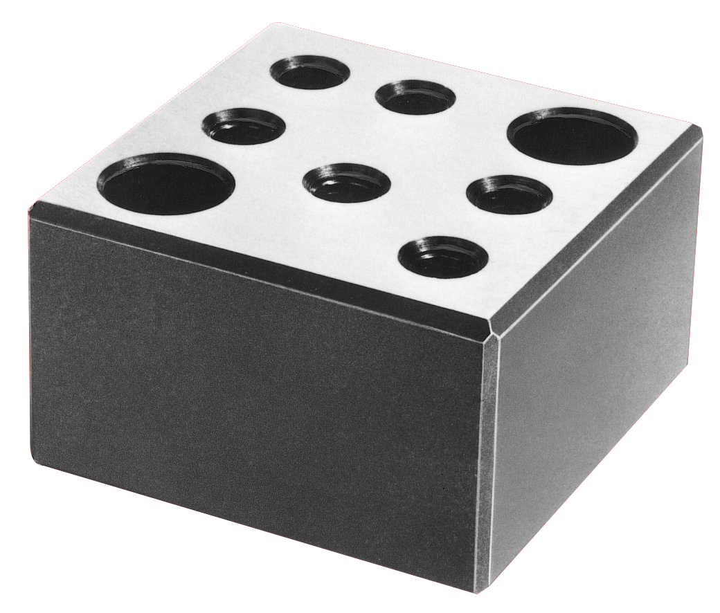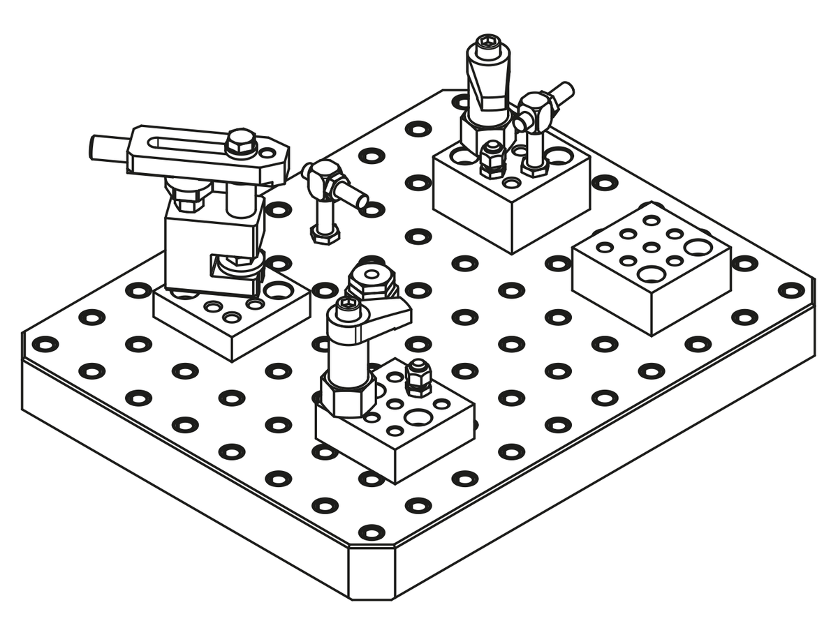 Riser blocks are used to achieve a certain support height. The additional tapped holes in the risers are for mounting further fixture elements.