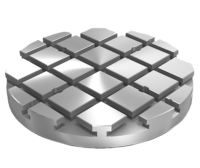 Round baseplates with T-slots are used for constructing modular fixtures. These baseplates are positioned and mounted directly on machine tables.