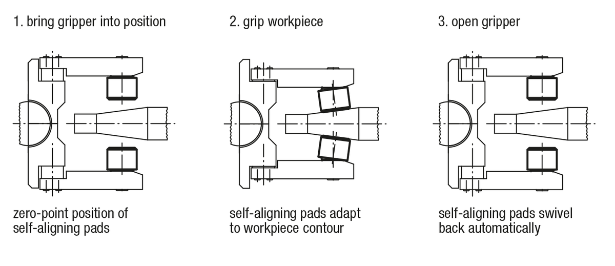 Self-aligning pads are used to support and clamp unmachined and machined workpieces.