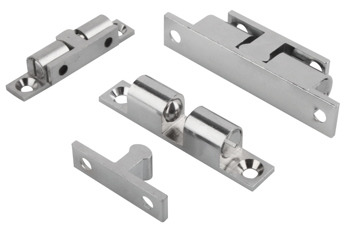 Quick catch for various applications such as holding doors, hatches, screens etc. closed. The double ball catch consists of a housing and a latch bracket that engages between the two balls. The latch bracket can engage from the front or the side. The engagement pressure is adjustable.