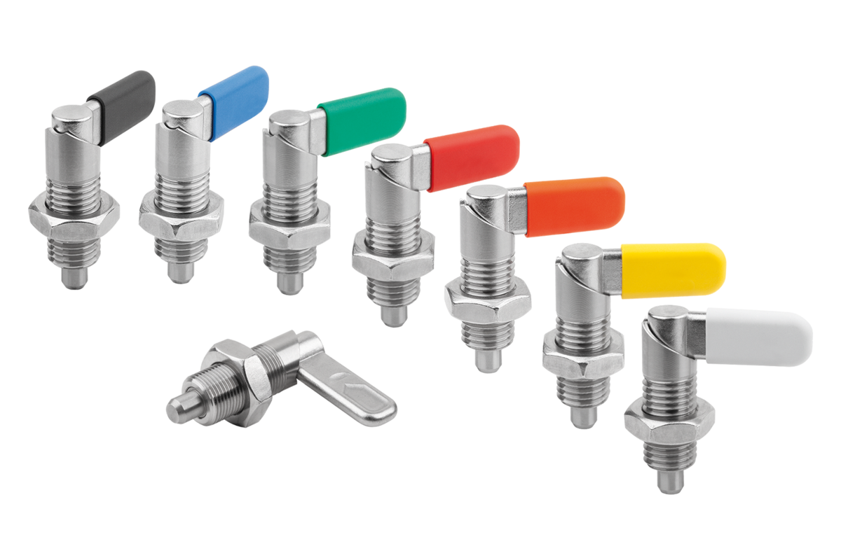 Cam-action indexing plungers are used where any change in locking position due to lateral forces should be prevented. Turning the grip through 180° retracts the indexing pin, enabling a change in the indexed position. The notch ensures that the grip remains in this position and the indexing pin remains retracted.