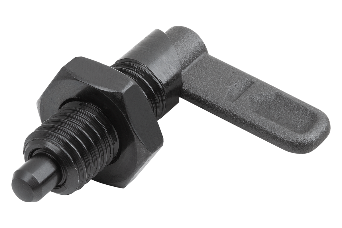 Cam-action indexing plungers are used where any change in locking position due to lateral forces should be prevented. Turning the grip through 180° retracts the indexing pin, enabling a change in the indexed position. The notch ensures that the grip remains in this position and the indexing pin remains retracted.