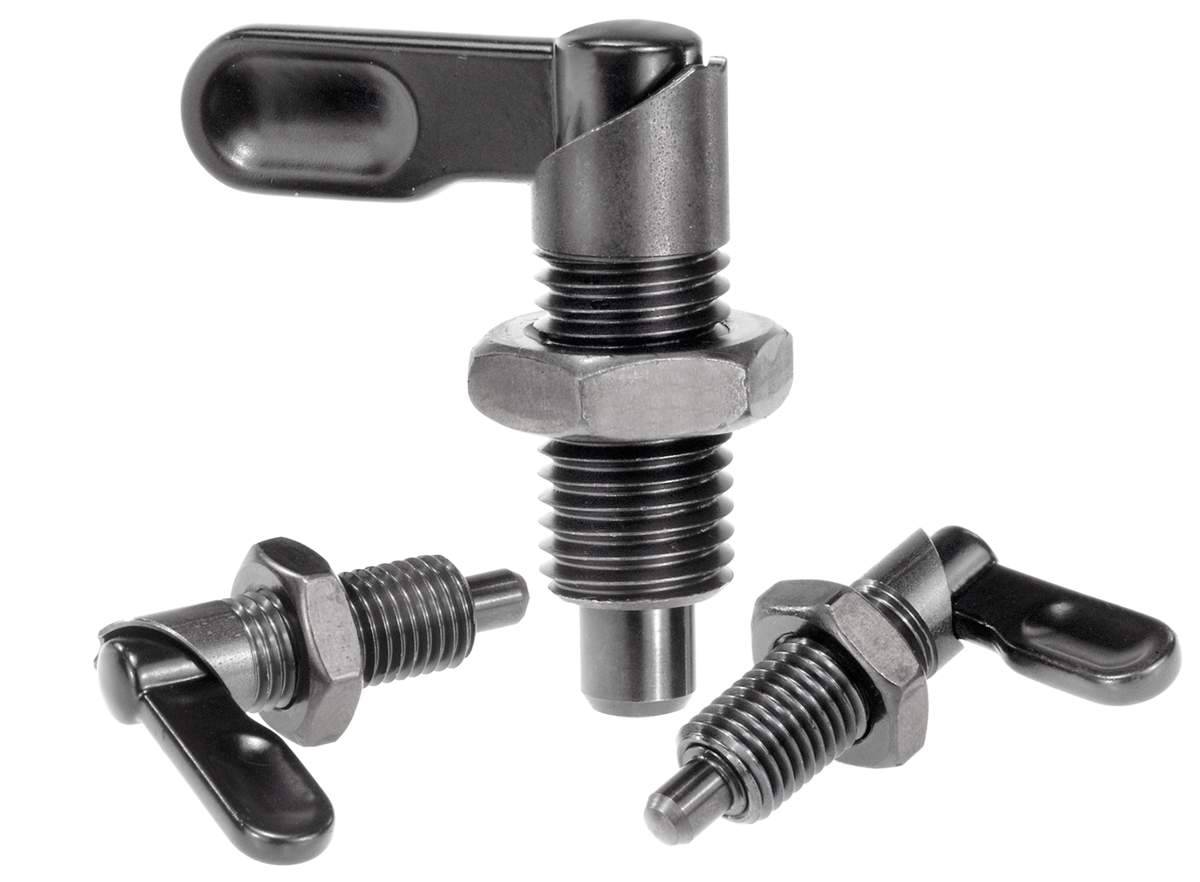 Cam-action indexing plungers are used when the indexing pin should not project all the time. Turning the handle through 180° retracts the pin and a notch ensures that the handle remains in this position.