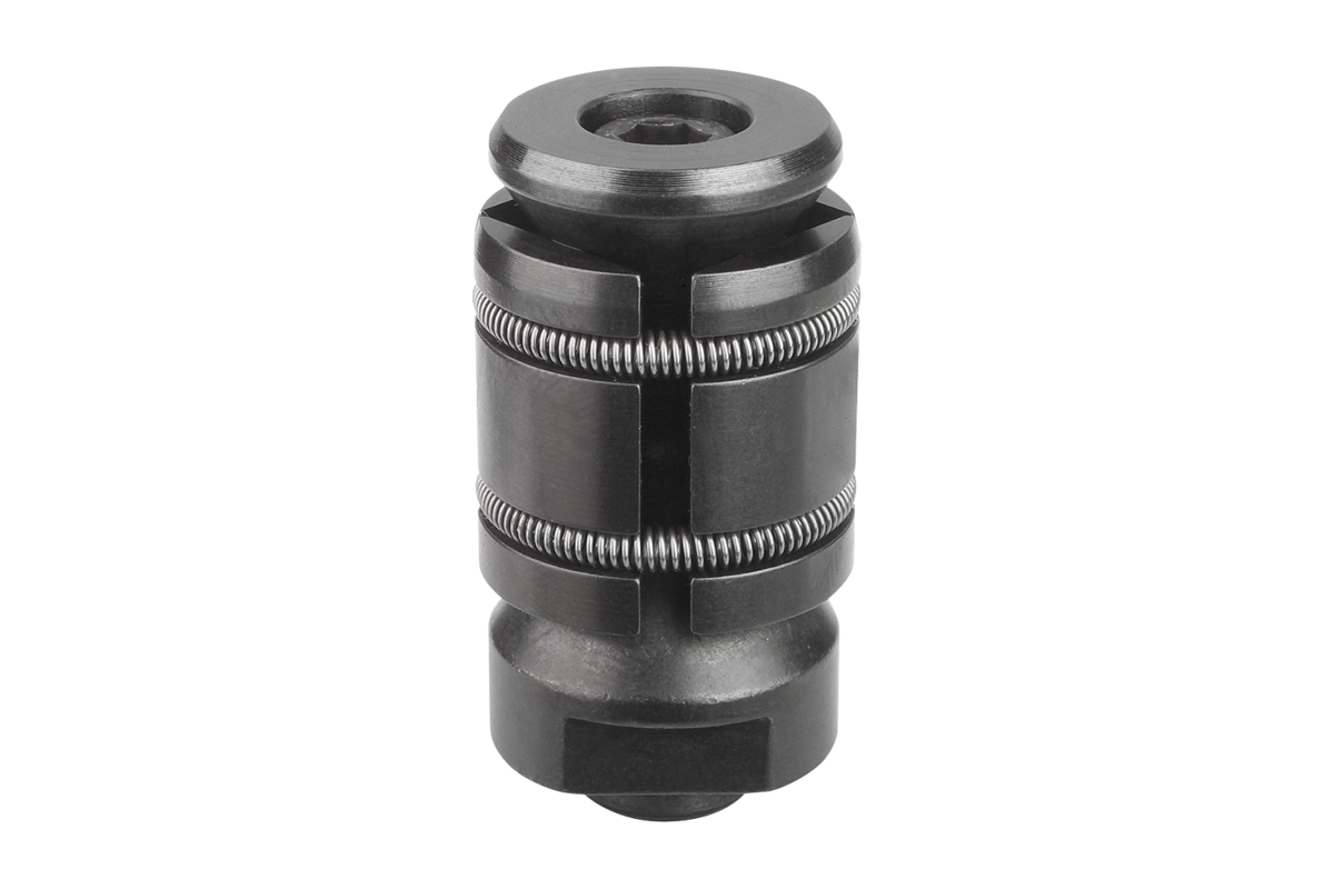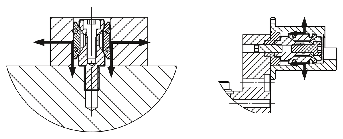 These centering clamps enable workpieces to be centered on and lightly clamped in a bore. The clamps have a wide expansion range. The series covers a bore range of Ø12 to Ø30 mm. To increase the centering accuracy the clamps with internal thread have a centering spigot (D2) for a locating hole. The centering accuracy is ±0.2 mm.