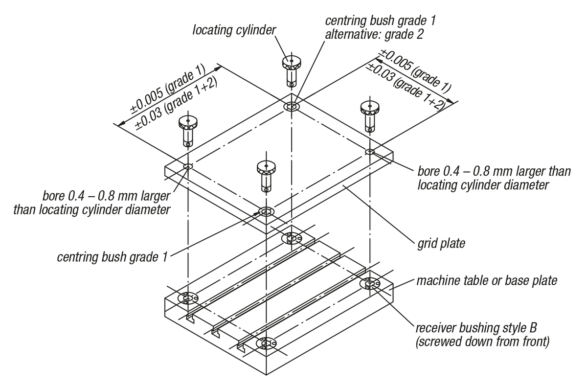 By a center distance tolerance of ±0.03 mm and one grade I and one grade II centering bushing a repeat accuracy of 0.04 mm is possible.