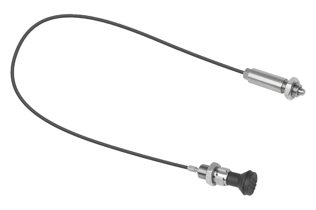 The indexing plunger is connected to the operator side by a Bowden cable. The combination of indexing plunger and actuating element forms a complete system which can be used for many types of application. Form D should be used for applications where the indexing pin should remain disengaged for an extended period and be prevented from springing back.