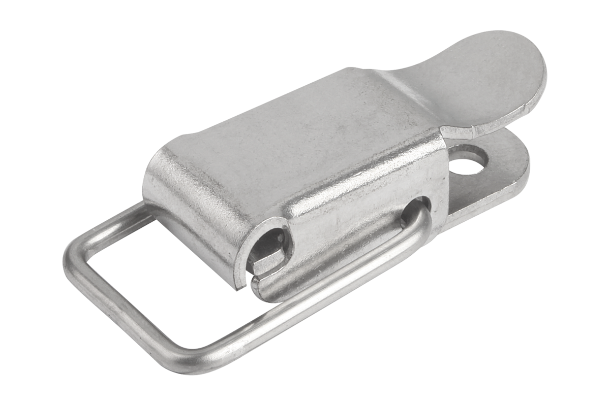 Latches with draw bail for securing and locking hatches, container lids, machine cladding etc. By exceeding the dead center they resist vibration.