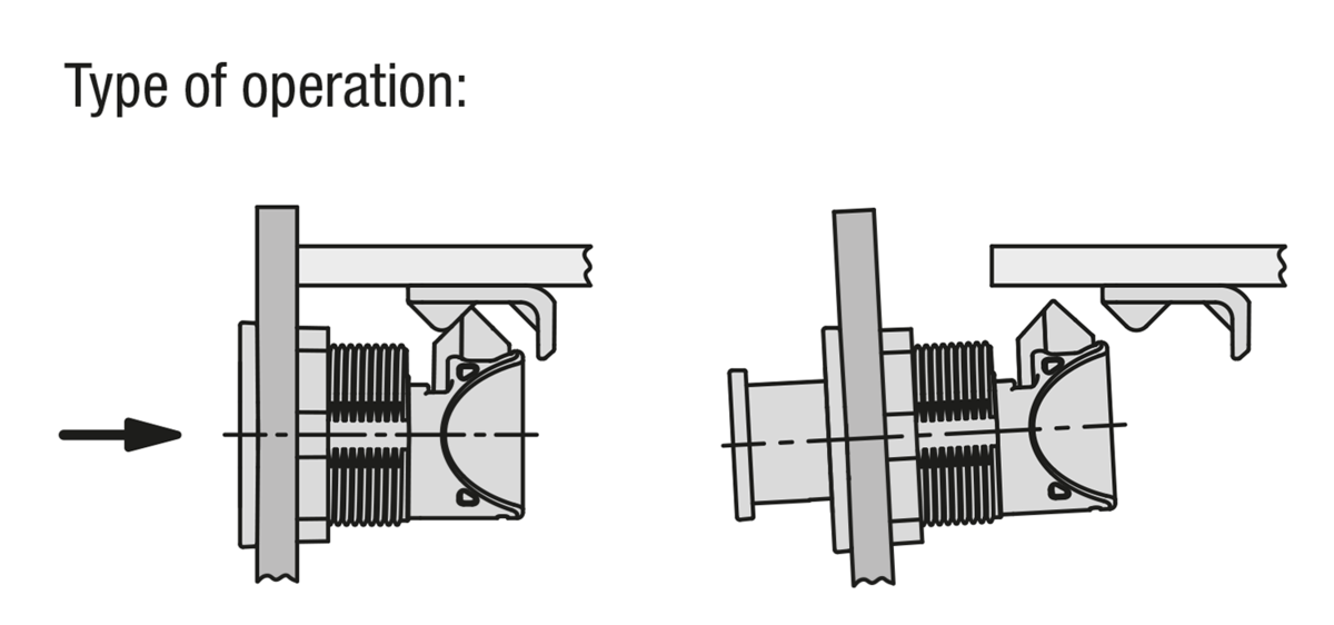 When not actuated, the knob is flush with the housing. When the knob is pressed, it springs out and can be used to pull the door open. The door latches automatically when pushed shut. Press the knob in again to make it flush with the housing.