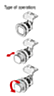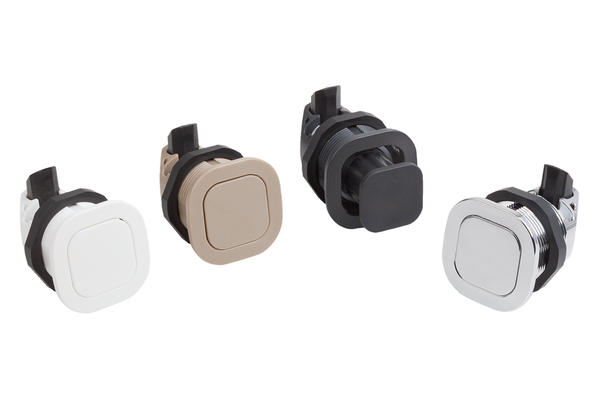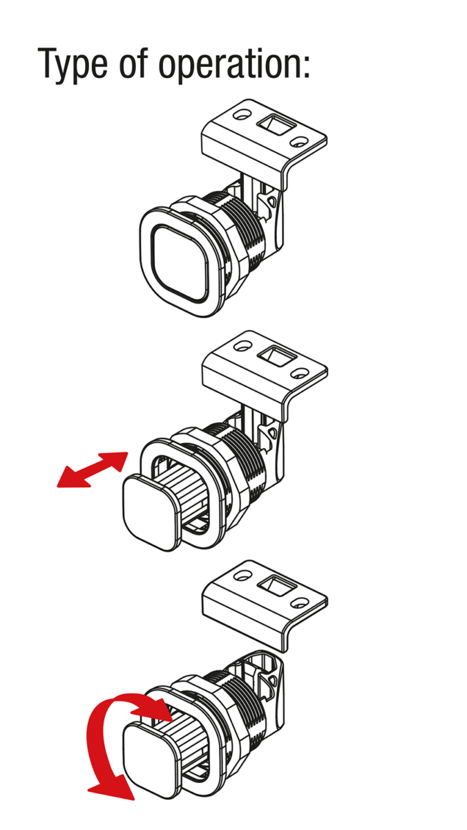 When not actuated, the knob is flush with the housing. When the knob is pressed, it springs out and can be used to retract the latch by twisting to the left or right. The door latches automatically when pushed shut. Press the knob in again to make it flush with the housing.