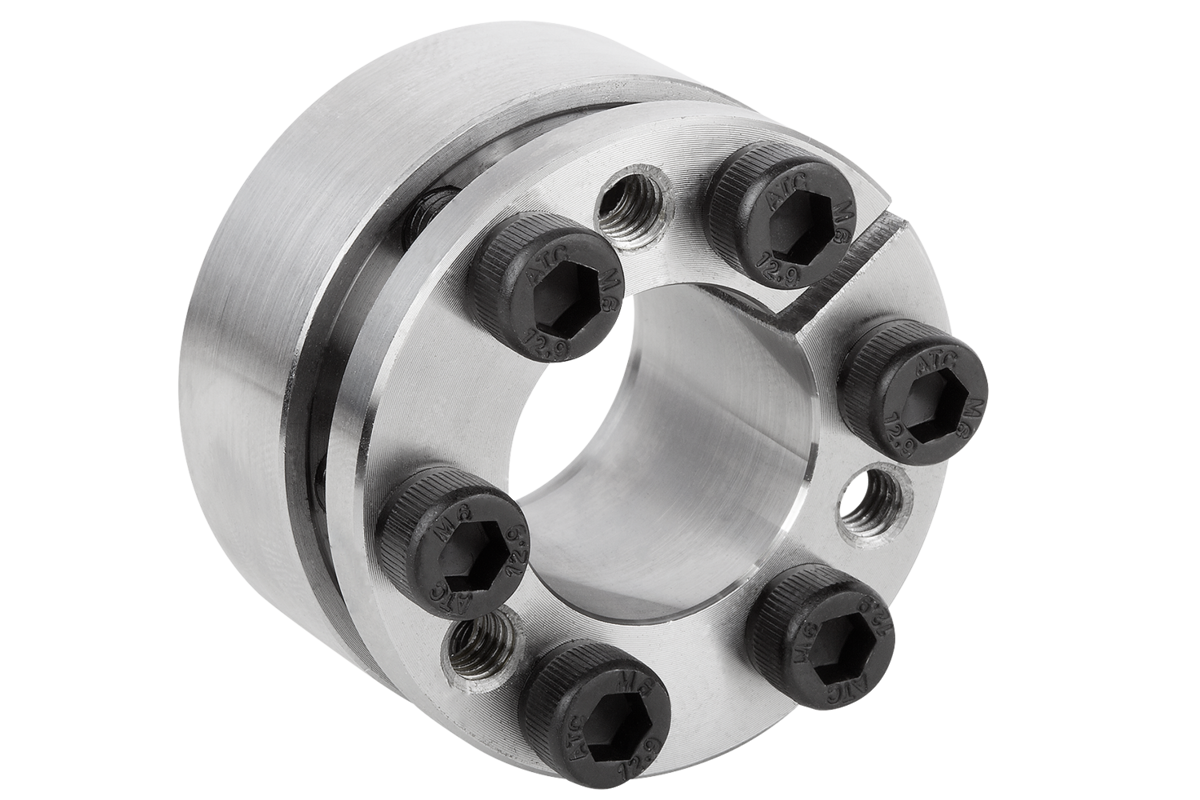 Lightly oil keyless locking coupling on the tapered faces and contact points of the shaft and hub. Do not use MoS2 or grease. Insert keyless locking coupling in the hub seat and slide onto shaft. Tighten screws crosswise in several increments to the defined tightening torque.