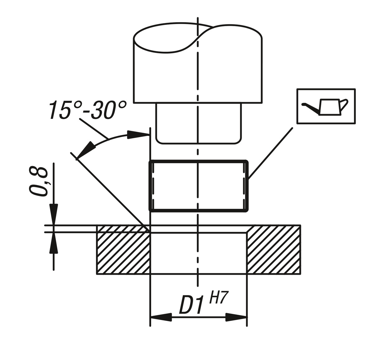Chamfer (press-in side 0.8 to 1.2 x 15°).