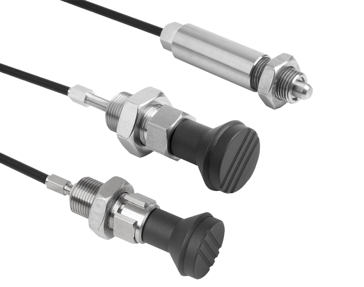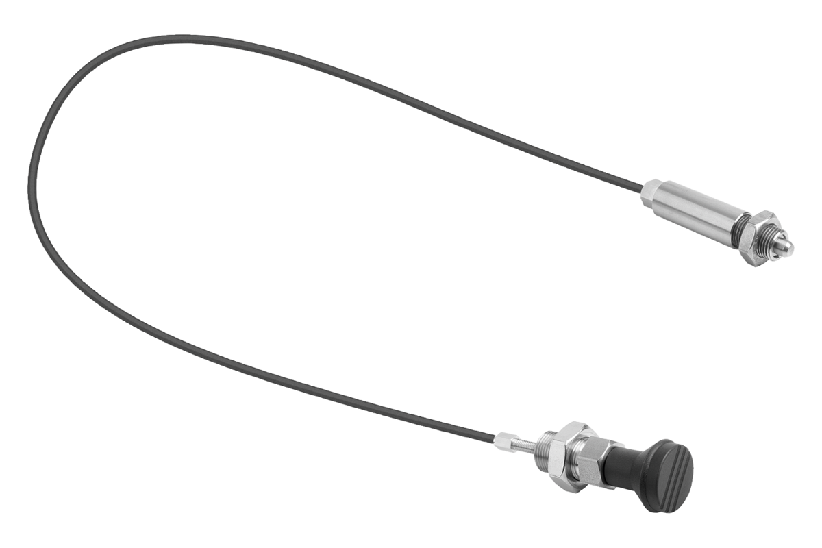 El acoplamiento entre perno de bloqueo y lado de operador se realiza mediante un cable Bowden. La combinación del perno de bloqueo y el elemento de accionamiento forma un sistema completo que puede utilizarse en muchas aplicaciones. Si se desea que el desacople sea permanente y que la clavija de bloqueo no rebote, hay que utilizar el elemento de accionamiento de forma D con función de retención.