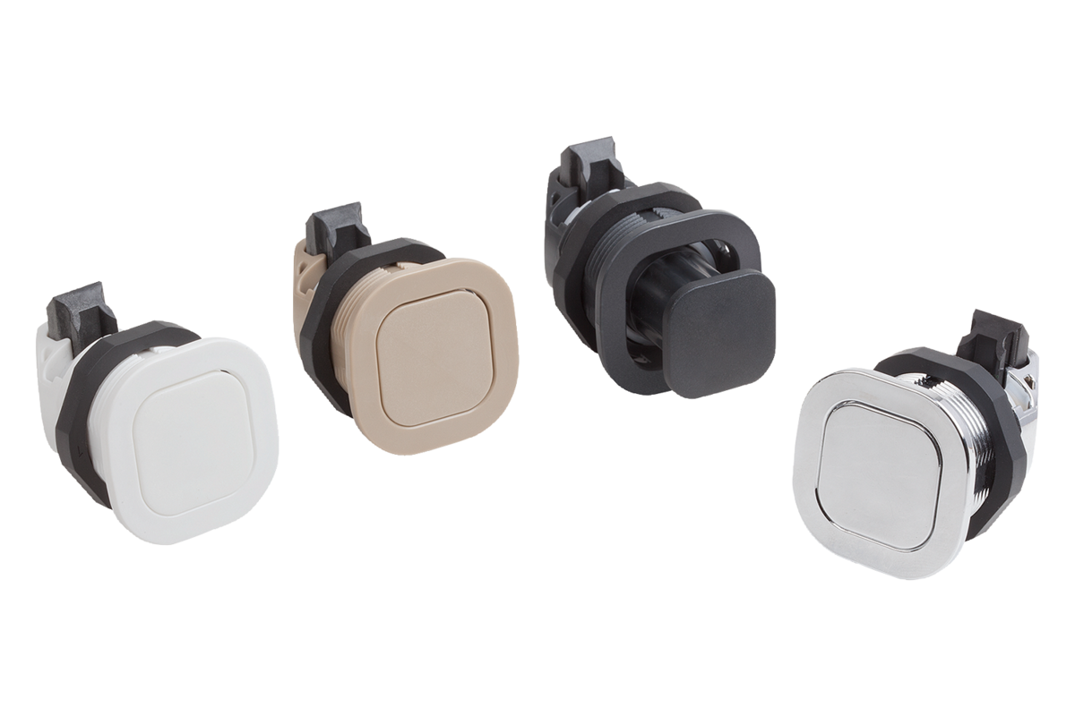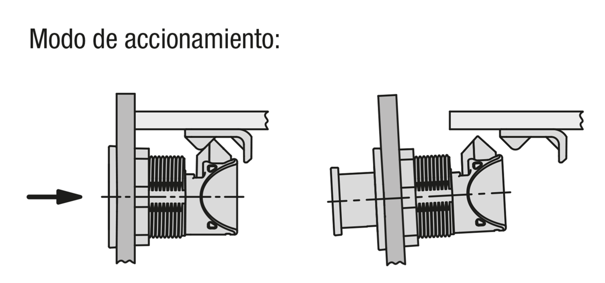 Sin accionar, el botón está a ras de la carcasa. Si se presiona el elemento de accionamiento, sale hacia fuera y se pueden abrir las puertas tirando. El bloqueo se garantiza automáticamente presionando la puerta. Volver a presionar el botón para restablecer el estado no accionado.