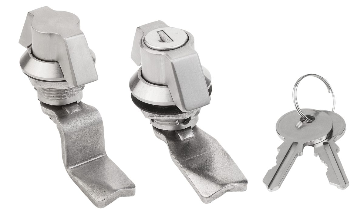 Cierre de cuarto de vuelta con botón de mariposa. Utilizable a la derecha o la izquierda con una carrera de cierre de 90°. El cierre de cuarto de vuelta se puede instalar previamente montado. Suministro con tuerca estándar de acero inoxidable. El cuarto de vuelta bloqueable se suministra con 2 llaves. La llave se puede extraer en ambas posiciones (abierta y cerrada). El cierre es uniforme, es decir, cada cerrojo se abre con la misma llave (cierre 1333).