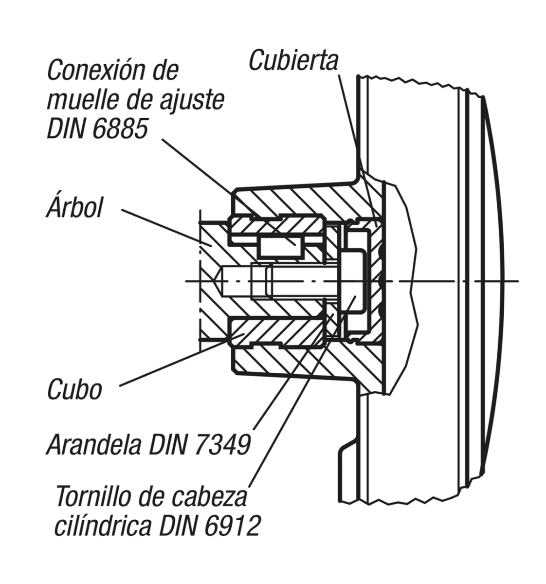 Los volantes se tienen que asegurar axialmente o fijar mediante un tornillo de cabeza cilíndrica DIN 6912 y una arandela DIN 7349 mediante la conexión del chavetero en el árbol.