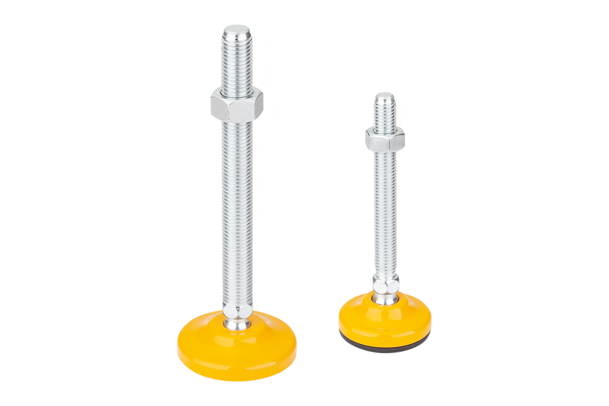 Pies articulados de acero con gran capacidad de carga y con pie lacado en amarillo, placa antideslizante opcional. La placa antideslizante absorbe vibraciones e impide la caída del pie articulado.